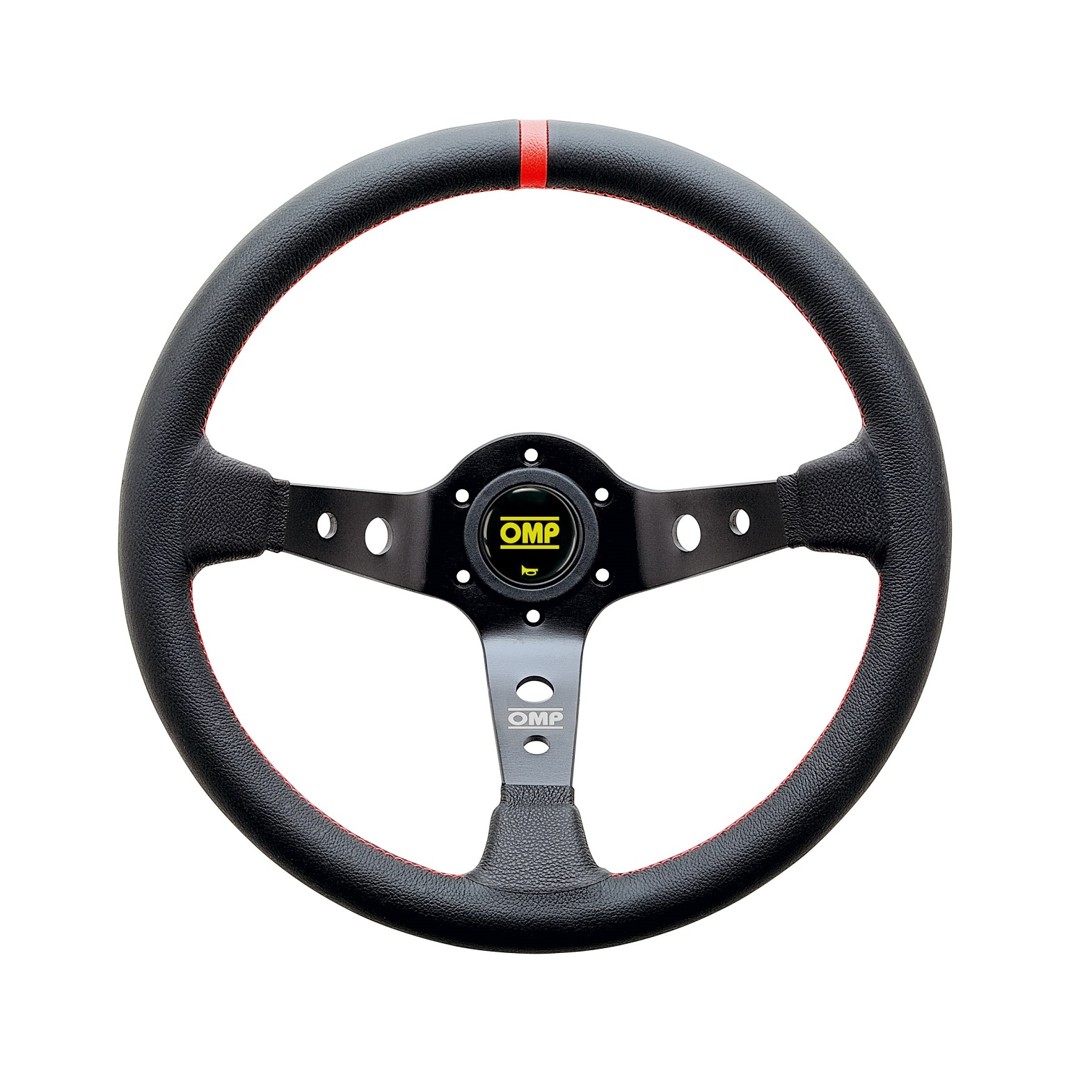 Com 350mm de diâmetro, feito em alumínio anodizado e em Pele, costuras vermelhas e risca vermelha.